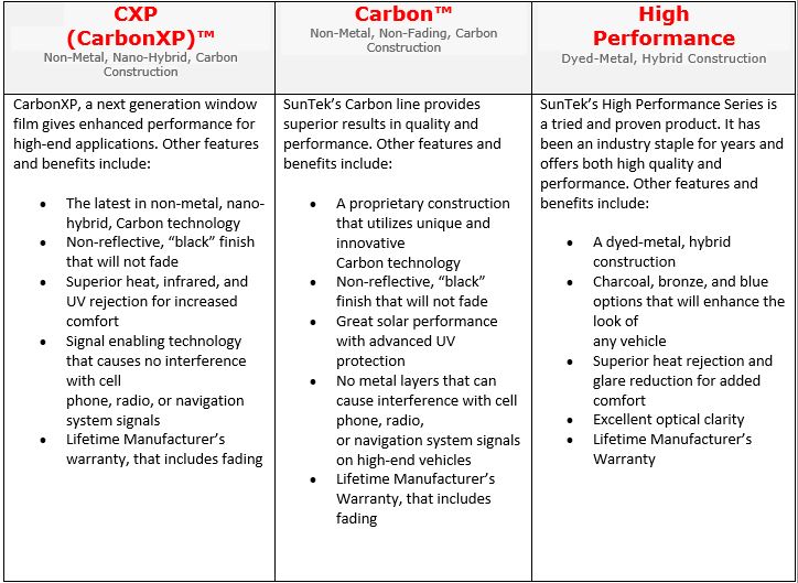 Note: All window films must be applied in accordance with local tint laws.